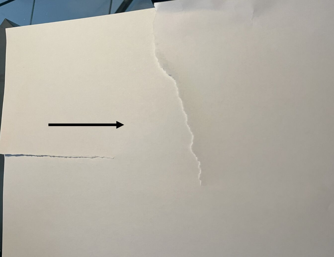 Wird das Papier nun entlang der kurzen Seite (210 mm) eingerissen, geschieht dies mit der Faserrichtung – der Riss ist glatt.